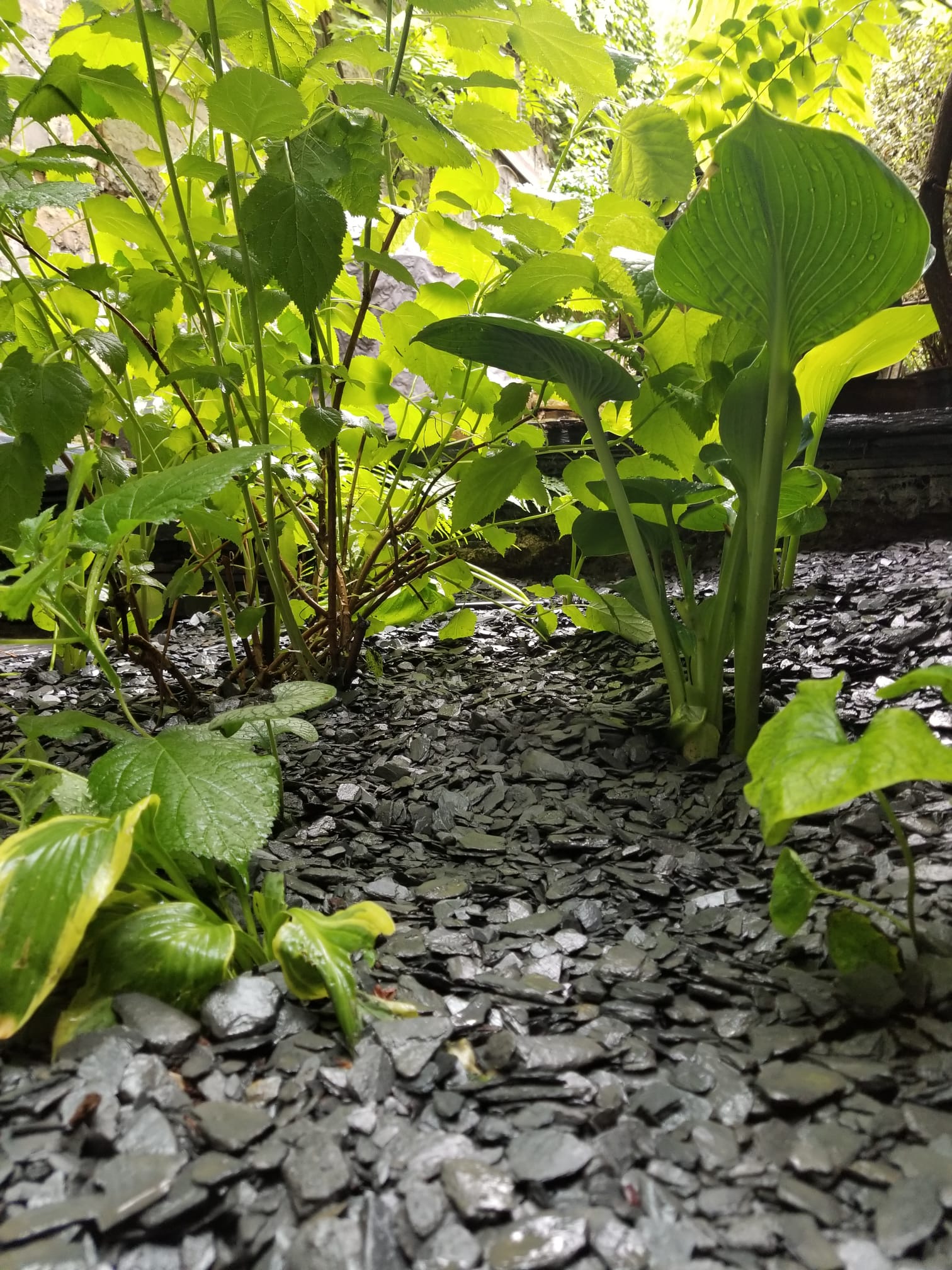 Les plantes, adaptées à l'ombre, apportent une touche de verdure discrète. Les érables du Japon côtoient les orangers du Mexique, tandis que les hostas et les pierris japonica ajoutent de la texture et de la couleur. Ces choix botaniques évoquent une ambiance sereine, rappelant les jardins zen.