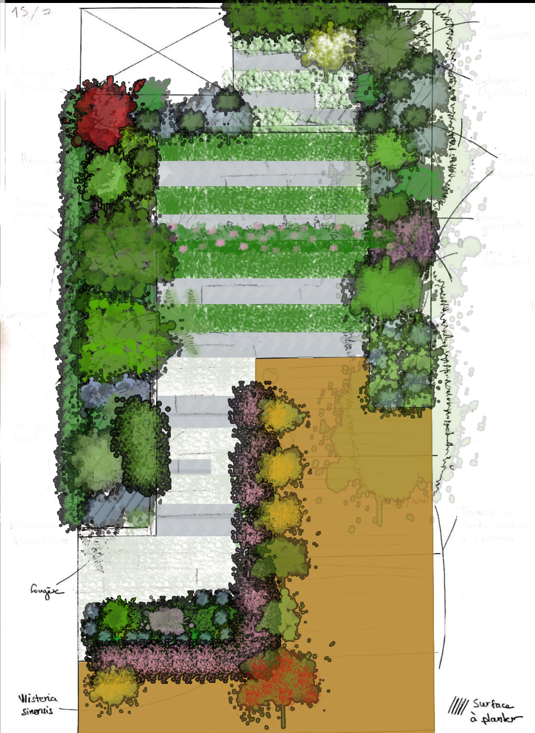 La grande glycine qui borde la terrasse en bois vous invite à vous immerger dans ce monde végétal. Elle vous guide vers le cœur du jardin, où des pétales d'ardoise ornent le pied des massifs, ajoutant une texture riche au paysage. Et comme si cela ne suffisait pas, un rosier grimpant s'étire gracieusement le long d'un câble métallique, formant une arche végétale qui vous enveloppe de sa beauté.