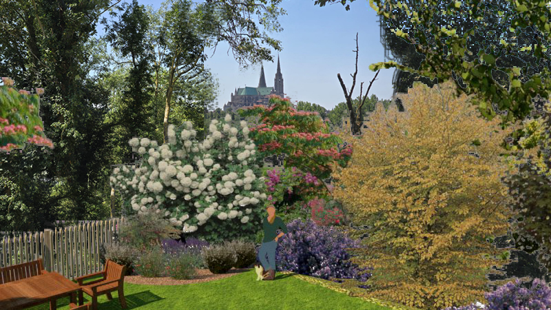 La terrasse surélevée Continuez votre promenade vers la terrasse en bois surélevée, d'où la vue sur la cathédrale de Chartres est à couper le souffle. Ici, un filet de repos, inspiré des catamarans, est suspendu audacieusement au-dessus d'un jardin de plantes humides. Allongez vous, laissez vous bercer par la brise légère et admirez la végétation luxuriante en dessous – un vrai moment de sérénité.