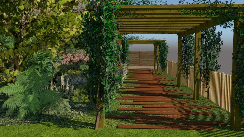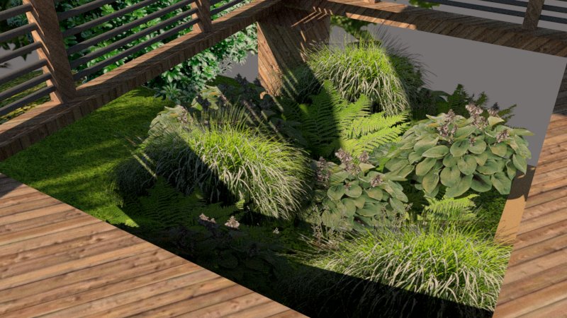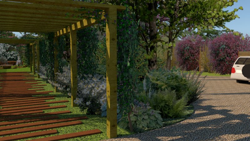 Le tunnel enchanté Avancez vers le tunnel de bois où l'Akebia, une plante grimpante robuste, enveloppe la structure en un dôme vert, créant une entrée presque féerique qui sépare le monde extérieur de notre sanctuaire. Ce passage, où la lumière filtre doucement à travers les feuilles, vous mène vers le cœur du jardin. Sur votre gauche, découvrez une mini-forêt humide de 20 mètres carrés. Ce coin d'ombre est peuplé de fougères, d'hostas et de graminées, rappelant les sous-bois naturels où la lumière danse entre les feuilles.